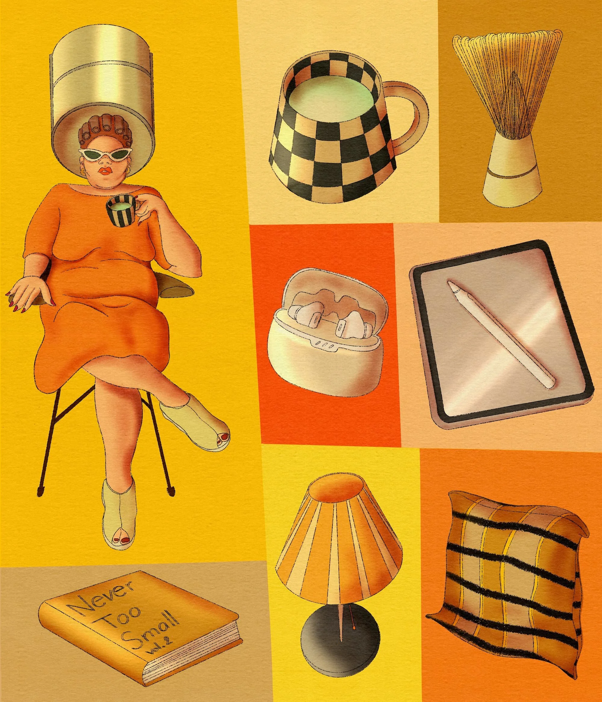 Illustration d'une femme assise portant une robe orange, portant des lunettes de soleil, avec une tasse dans la main. Autour d'elle, différents objets de décoration en jaune, orange, beige et noir : une tasse à motif quadrillé, une boîte à écouteurs, un stylet, une lampe de bureau, un livre intitulé 'Never Too Small', une lampe de table et un coussin à carreaux.
